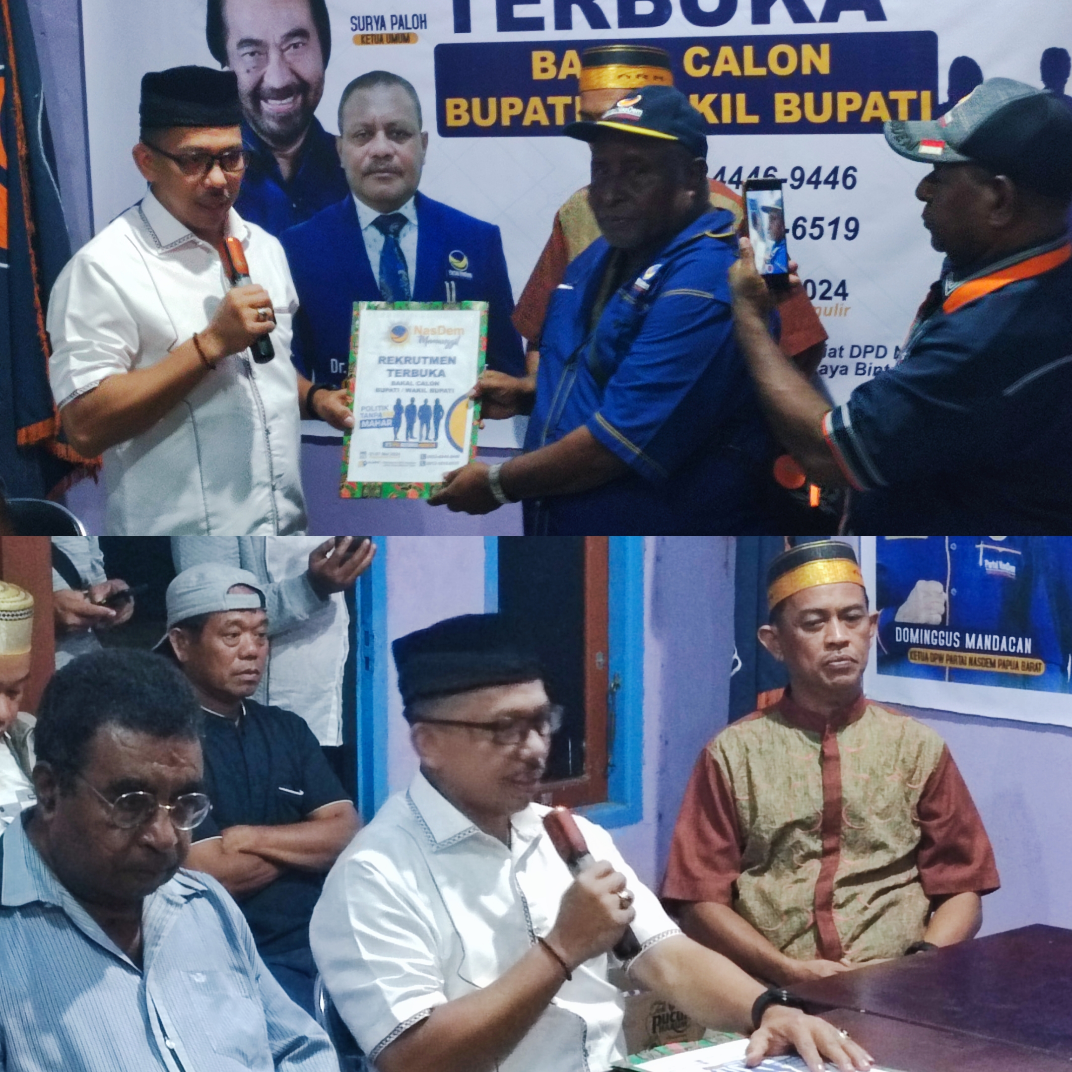 Bakal Calon Wakil Bupati (Bacawabup) Dr Alimudin Baedu sekitar pukul 21.00 Wit diantar simpatisannya mengembalikan formulir pendaftaran kepada tim penjaringan bakal calon bupati (Bacabup) dan bakal calon wakil bupati (Bacawabup) di Sekretariat DPD Partai NasDem kabupaten Teluk Bintuni di Tisai distrik Bintuni Timur.