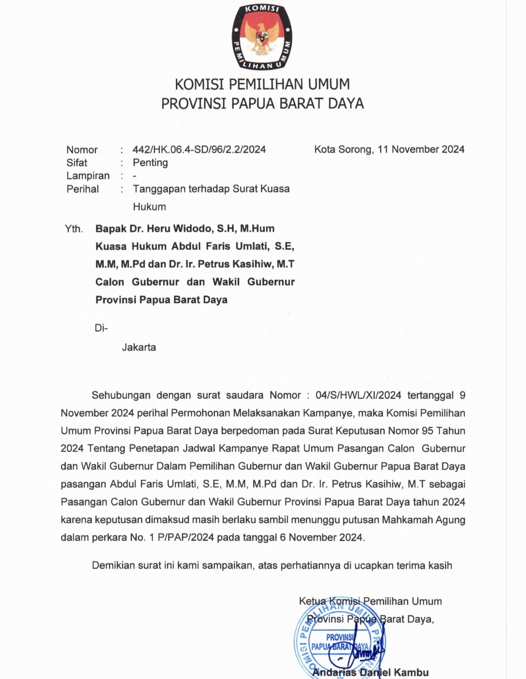 “Karena keputusan dimaksud masih berlaku sambil menunggu putusan Mahkamah Agung dalam perkara nomor : 1 P/PAP/2024 pada tangan 6 November 2024,” demikian yang tertuang dalam isi surat KPU Papua Barat Daya Nomor : 442/HK.06.4-SD/96/2.2/2024, perihal tanggapan terhadap surat kuasa hukum.