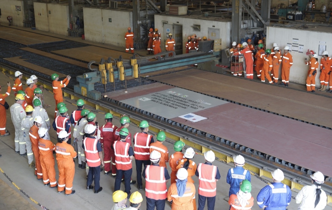 Pemotongan rangka besi ini menandakan dimulainya fabrikasi jacket anjungan yang akan digunakan dalam proyek Tangguh UCC.